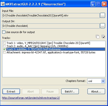 4. Pada input file,cari video yang akan diekstrak subtitlenya,jangan lupa beri klik tanda centang pada Track 3 : subtitles lalu klik Extract