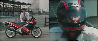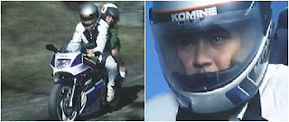 Nah,kalo yang motor Suzuki biru muda-putih itu mungkin kalian sudah banyak yang lupa,soalnya motor itu cuma muncul di episode 37 saja.Motornya dilengkapi dengan Helm yang lagi-lagi mereknya SHOEI,tapi beda warna dengan yang pertama tadi.Yang ini corak warnanya putih dengan garis warna merah hitam