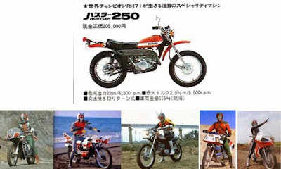 Selama era shwa,Suzuki menjadi merek motor andalan yang dipakai di semua serial kamen rider di jaman itu.Hanya harley davidson lah satu-satunya platform diluar suzuki yang ada di kamen rider super one.Penggunaan motor suzuki ini karena dari segi bentuk,motornya ramping dan gampang untuk dimodifikasi,apalagi menilik dari segi cerita rider era showa,banyak adegan berkendara di areal terjal,sehingga butuh motor yang pas dan dipilihlah suzuki sebagai motor utama di serial kamen rider.