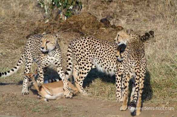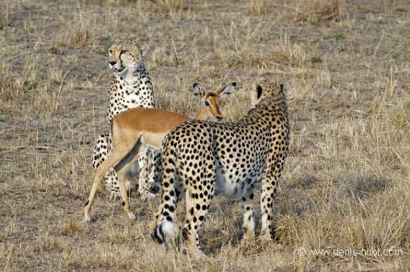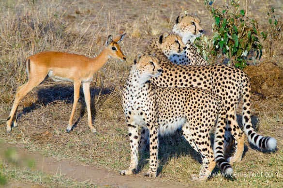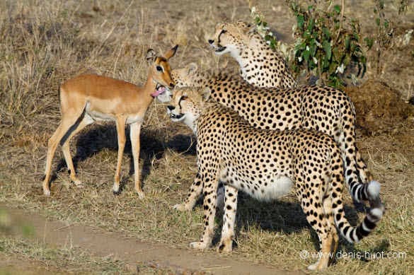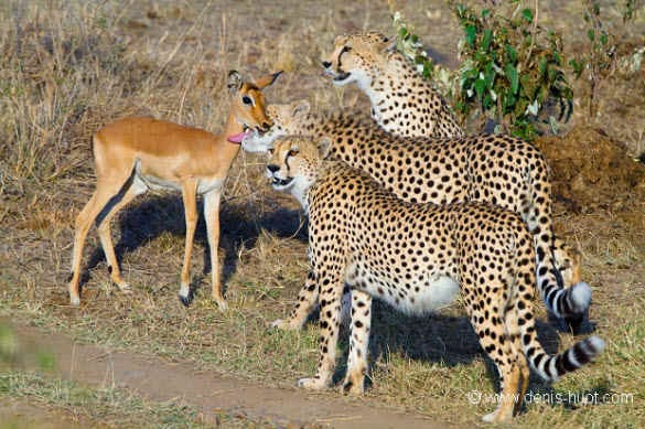 Foto-foto ini di ambil di taman safari Kenya oleh Fotografer ternama Michel Denis-Huot. Dia cukup terkejut dengan apa yang dilihatnya. ” Ini tiga Cheetah bersaudara dan satu ekor impala telah hidup bersama sejak mereka meninggalkan ibu mereka di sekitar 18 bulan yang lalu, “katanya. “Pada pagi hari kami melihat mereka sepertinya tidak terlihat lapar, berjalan cepat tetapi kadang-kadang berhenti untuk bermain bersama.”Benar-benar unik ya.. kejadian yang jarang di temui tapi memang ada.Kalau cheetahnya laper kira-kira makan apa ya ? barangkali cheetah yang ini vegetarian atau mungkin cheetah yang baik hati hehe…