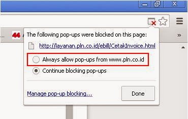 7. Lihat pada bagian atas browser kalian > klik kotak kecil bertanda merah > pilih Always allow pop-ups from www.pln.co.id > klik Done