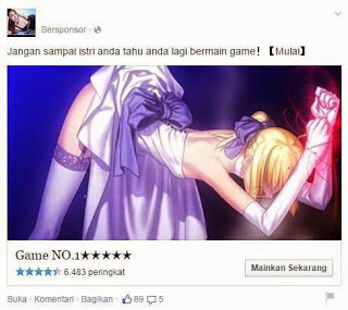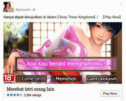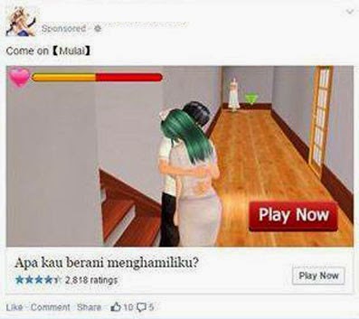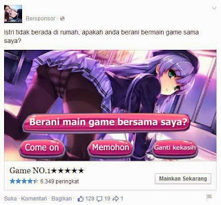 Haloo sobat media2give^^ Ketemu lagi nih dengan kalian di posting ini ya.. Kali ini saya akan membahas informasi menarik tentang Game Mengajak Berbuat Mesum Muncul Di Facebook.Hmm,kalau baca judulnya jadi gimana gitu ya,kok ada game dewasa yang sampai bisa masuk ke facebook dan iklannya muncul setiap hari.Ya,belum lama ini pengguna facebook memang di kejutkan dengan sebuah iklan dari pembuat game yang isinya tidak pantas untuk dilihat banyak orang.Di dalam iklan tersebut terdapat sebuah iklan yang mengandung sifat provokatif,mengajak untuk berbuat sensual.