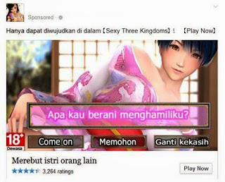 iya sih,klo iklan game dewasa gitu suka bikin penasaran hehe.. cara promosinya dibuat spt itu biar banyak yg ngeklik iklannya,tapi menggangu pengguna fb juga tuh mas iklannya