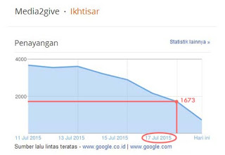 Saya sendiri juga ikut tradisi tersebut dan nggak punya waktu mengurus blog.Bisa dilihat penurunan visitor itu pada statistik blog media2give ini.Penurunan mulai terjadi di H-3 lebaran.Udah keliatan tuh grafiknya semakin kebawah sampai pas tanggal 17 Juli 2015,disitulah titik terendah penurunan pengunjung blog.Pageviews blog media dari tanggal 11-17 Juli 2015