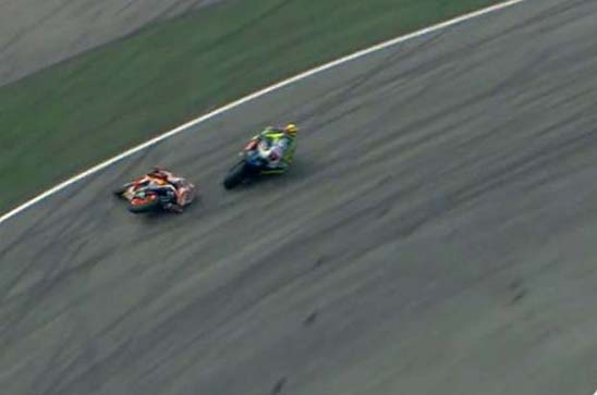 Marquez mengatur strategi agar Rossi tidak bisa mendekati Lorenzo.Rossi yang merasa tidak nyaman,langsung menanggapi aksi Marquez ini dan terjadilah sebuah Insiden yang di awali pada sebuah tikungan,dimana Rossi melambat dan membuat Marquez berada di sisi lebar trek.Marquez berusaha masuk ke dalam,sementara line balapnya tidak memungkinkan.Rossi berulang kali menengok ke arah Marquez dan ketika motor mereka terlalu dekat,senggolan pun tak bisa di hindari.Disitu terlihat kaki kiri Rossi bergerak dan menyebabkan Marquez crash.