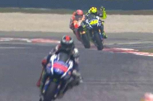 Dengan skill dan pengalaman,Rossi bisa mengatasi Marquez dalam beberapa tikungan.Namun Marquez selalu membalas dan memberi perlawanan.Rossi merasa aksi Marquez ini cukup menggangu.Berkali-kali bahkan Rossi menengok ke belakang,ke arah Marquez.Marquez tak menanggapi bahasa tubuh Rossi tersebut dan tetap melakukan battle dengan Rossi.Tidak cuma itu saja,Rossi sempat memberikan isyarat dengan mengangkat tangannya,sebagai tanda pada Marquez agar jangan menggangunya.Disitu Rossi sadar,bahwa tujuan Marquez adalah memperlambatnya dan menjauhkan gap antara Rossi dan Lorenzo.