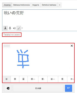 Satu per satu lagu Saya dengarkan,hingga sampai di lagu ke 11 dan benar aja,itu lagu yang selama ini Saya cari-cari.Judulnya di tulis pakai huruf kanji dan tidak ada romajinya.Jadinya susah kalau mau mencari dengan Title Song itu.Akhirnya Saya coba dengan bantuan Google Translate,memanfaatkan fitur menulis kanji secara manual.Habis corat-coret,di dapatlah sebuah judul lagu yang bernama Tatakai No Arano.Dengan petunjuk itu,Saya langsung mencari lagunya dengan keyword 戦いの荒野 ジャンパーソン.
