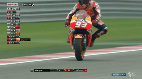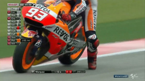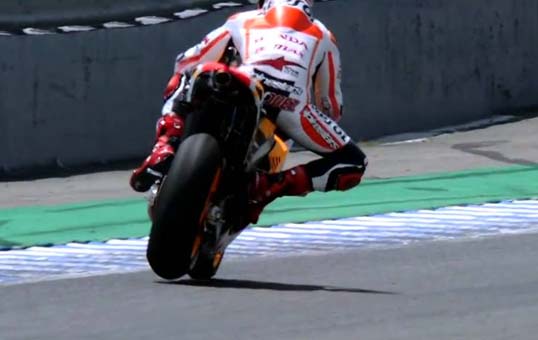 Dalam kondisi belum stabil,motor langsung di belokkan.Marquez melakukan gerakan pivot dengan tumpuan ban depan,bahkan saat ban belakang masih terangkat.