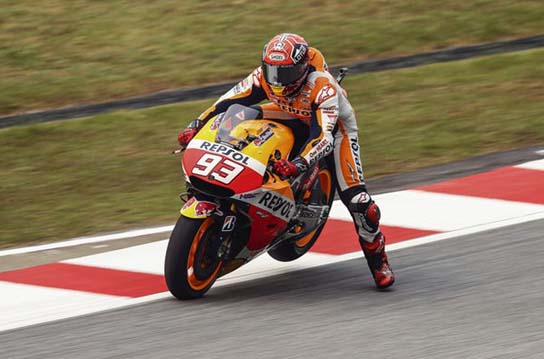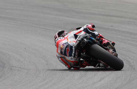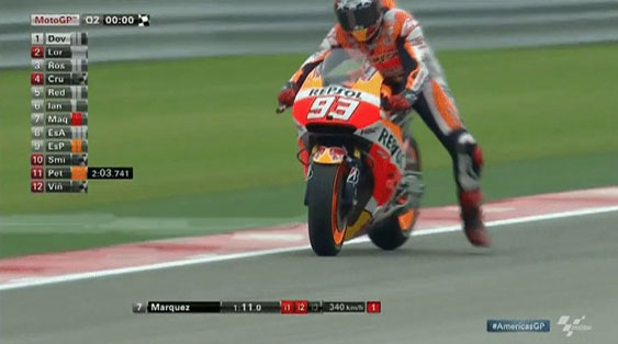 Marquez mulai menurunkan kakinya untuk memindah massa/berat ke kakinya sambil tetap mempertahankan posisi tegak motor.