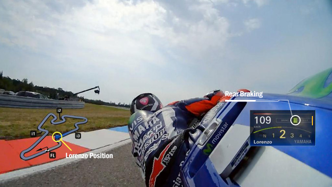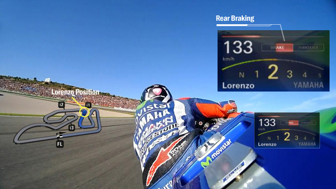 Warna merah menunjukkan seberapa besar rem di gunakan.Jika Brake Full berubah jadi merah,artinya Lorenzo menekan rem untuk memakai tenaganya secara penuh.Tapi di gambar,warna merah hanya sebagian saja,mungkin sekitar 60%.Nah,jika itu adalah tikungan yang pendek,tidak mungkin Front Brake terus yang di pakai,bisa-bisa motor malah kehilangan tenaga dan berhenti.Bisa di simpulkan jika Lorenzo itu sedang menggunakan Rear Brake,terlihat dari kemiringan motor dan posisi balap Lorenzo.