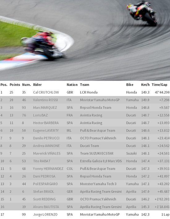 Cal Crutchlow yang tampil menawan karena keuntungan ban depan belakang Hard melaju sangat cepat.Saking kencangnya,dia sampai bisa melakukan Overlap pada Lorenzo.Ini momen memalukan sepanjang karir Lorenzo,sebab yang mengoverlap adalah motor dari Tim Satelit yang kondisinya tidak sebagus YZR-M1 miliknya.