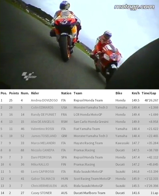 Sayangnya hujan tidak cepat turun,padahal balapan sudah berlangsung beberapa Lap.Di putaran ke 24 Stoner masuk Pit dengan ban yang sudah aus.Posisinya mundur jauh ke belakang dan tak bisa mengejar lagi ke depan.Sampai balapan selesai Stoner terpaku di urutan terakhir,malahan Dovizioso mudah mengoverlapnya setelah membuat jarak hingga 1 Lap di depan Stoner.