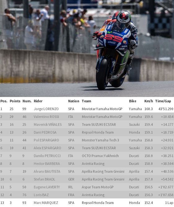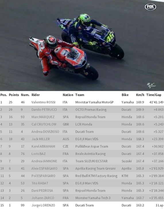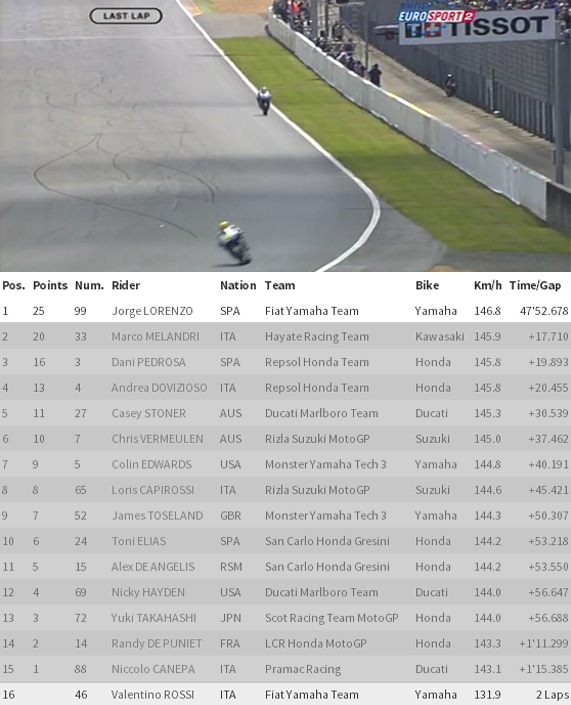 Hingga pada Last Lap Rossi berada di belakang Lorenzo dan melakukan Overlap.Lorenzo menengok belakang dan memberi jalan lewat untuk Rossi.Lorenzo akhirnya harus puas finish di posisi 15,terpaut jarak 1 Lap dari Rossi.Kejadian ini seperti balasan pada Overlap Lorenzo pada Rossi di GP Le Mans 2009 yang lalu.