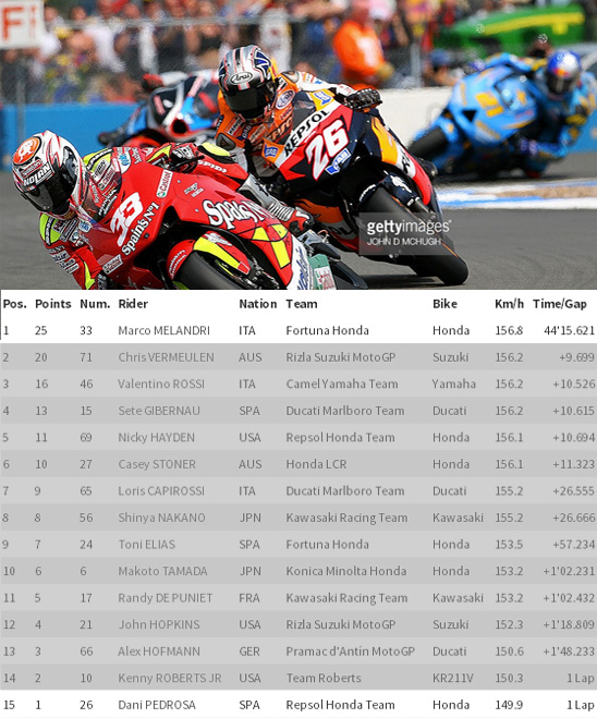 Posisi pembalap berubah total.Pedrosa yang keluar Pit merasakan motornya tidak beres.Kecepatannya makin melambat hingga tercecer di urutan 15.Sang pemimpin balapan,Marco Melandri malahan sampai bisa mengoverlap Pedrosa di Lap 24.Ini adalah kejadian memalukan pertama yang di alami Pedrosa pasca pindah ke MotoGP.