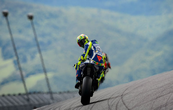 Sayangnya saat kembali ke lintasan,Race Director mendeteksi Rossi melanggar batas kecepatan saat berada di Pit Lane.Akhirnya sanksi Ride Through Penalty di jatuhkan pada Rossi.Rossi pun mau tidak mau harus pergi ke Pit mengganti motor,sesuai hukuman itu.Lorenzo yang mempunyai strategi lain dari Rossi,mencoba bertahan dengan ban basah.