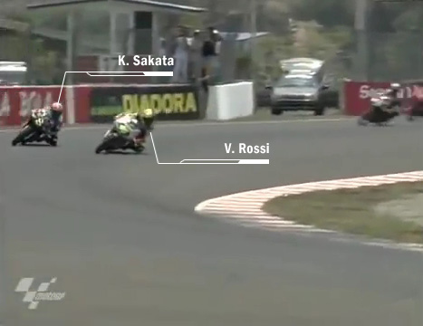 Tak berapa lama kemudian Rossi sukses menggusur tempat ke 2 Manako dan mengejar Sakata yang memimpin balapan.Rossi melakukan overtake menawan di sebuah tikungan dan menguasai jalannya race.Lap 10 Rossi membuka gap sejauh 3,935 detik di depan Sakata.Tak terkejar,Rossi pun memenangi balapan di Sentul setelah berjuang selama 26 Lap.Di depan Finish Line Rossi melakukan Wheelie,mengangkat roda ban depan tinggi-tinggi ke atas.