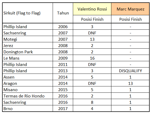 Statistik itu menunjukkan bagaimana prestasi Rossi dan Marquez saat Flag to Flag.Rossi tidak pernah menjuarai balapan dengan sistem Flag to Flag.Peluangnya 0% dihitung dari 2006-2017.Rossi hanya mampu maksimal podium 2 dengan presentase yang tidak besar (21%).Rossi lebih sering tidak mendapat podium pada balapan Flag to Flag.2 kali Crash memberikan tanda bahwa Flag to Flag tidak terlalu berbahaya untuk Rossi.