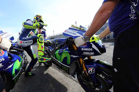 Beberapa lap kemudian hujan berhenti dan aspal perlahan mengering.Marquez langsung kembali lagi ke Pit untuk memakai ban kering.Rossi dan Lorenzo tidak mau pergi ke Pit.Lorenzo menunggu Rossi dulu untuk ganti motor.Sedangkan Rossi yang tengah memimpin race tidak mau melepas posisi puncaknya.Karena merasa tidak punya feeling bagus untuk memastikan saat yang tepat untuk ganti motor,Rossi selalu menerapkan cara yang sama.