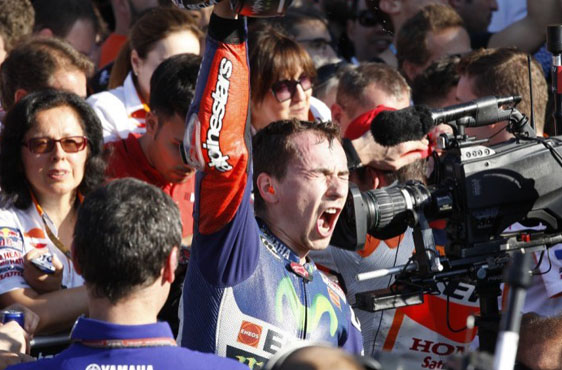 Lorenzo makin mundur posisinya usai di salip Rossi yang tampil ganas.Sampai balapan selesai,Lorenzo tetap bertahan di urutan 3.Sementara Rossi keluar sebagai pemenang.Dengan koleksi 313 poin,Lorenzo resmi mendapatkan gelar pertamanya di MotoGP.Saking senangnya,Lorenzo sampai menangis waktu melakukan selebrasi.Bahkan dia sampai tidak menanggapi ajakan Spies untuk bersalaman.Tangisan itu adalah bentuk luapan emosi bahagia Lorenzo.