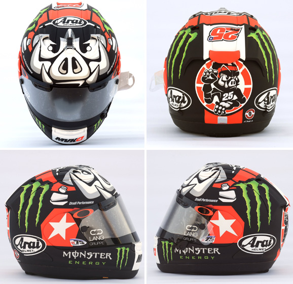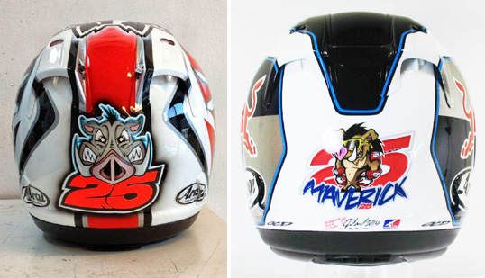 Bila di perhatikan,terdapat gambar grafis berupa Babirusa (Boar) di bagian depan helm Maverick.Desain ini spesial untuk balapan di Aragon.Biasanya sih kalau di Aragon,yang suka membuat desain helm unik itu Lorenzo.Contohnya tahun lalu Jorge menampilkan Shark Helmet dan pernah juga membuat helm Tribute to Shoya Tomizawa,juga helm dengan desain Gravity.Namun di tahun ini malahan Vinales yang punya ide desain helm spesial.