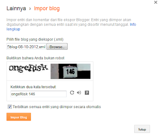 8. Untuk memanngil data yang di unduh tadi,klik lainnya > impor blog >browse,cari letal penyimpanan xml itu,lalu isi captchanya > klik impor blog.Tunggu prosesnya sampai selesai.Lamanya tergantung besarnya blog yang kita miliki.Saya pernah nyoba cara ini dan ternyata downloadnya lama.. gimana nggak,sizenya aja 12 Mb Hah? gede amat. Iya,kan postingnya udah banyak banget hehe..
